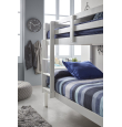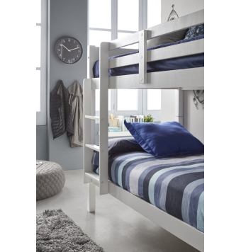Dos camas en vertical para ganar espacio sin perder luz. Estructura de madera con líneas suaves, barandillas altas y escalera frontal compacta que deja el cuarto despejado. Acabado blanco que ilumina y combina con todo. Hecha en España con detalle, pensada para la vida diaria.