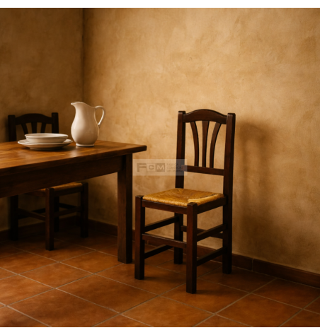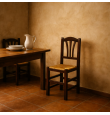 Silla de madera con chasis de pino macizo y reforzado con 4 escuadras de haya y 3 traviesas laterales.