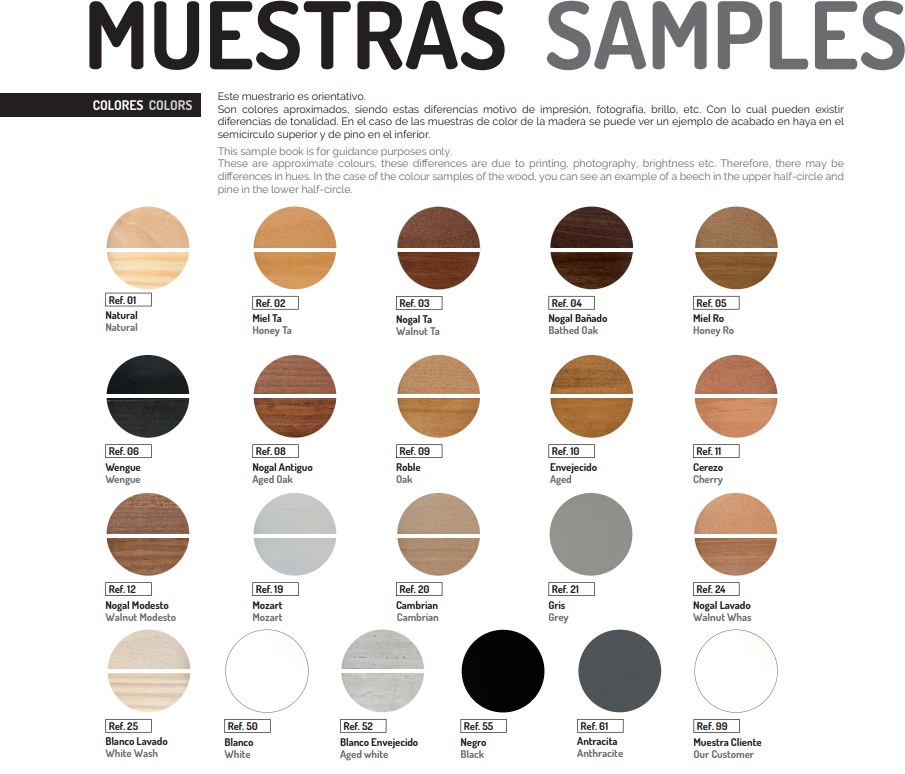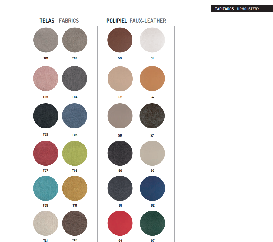 - TAPIZADO: Posibilidad en tela, polipiel ignífuga y tela cliente.