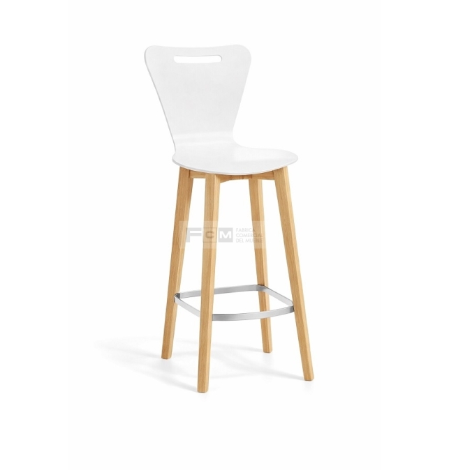 Taburete de madera con chasis de haya maciza, reforzado con 2 escuadras de haya y aro metálico.